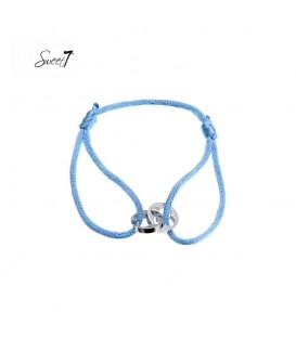 Lichtblauwe armband met satijnen koord en goudkleurige bedel. De lengte van de armband is 16 cm. De armband is nikkelvrij.