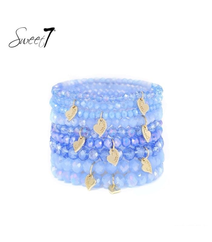 Hoe breng je kleur en sprankeling samen in een sieraden set? Deze armband bestaat uit meerdere elastische banden vol facetgeslepen blauwe kralen in verschillende tinten. Kleine goudkleurige hartjes bedels zorgen voor een verfijnde en speelse touch.