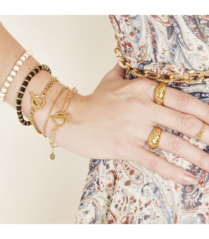 Goudkleurige armband met kapittelslot. Heb je een feestje, een bruiloft of wil je gewoon jezelf verwennen? Yehwang is een modern, hip en eigentijds sieraden merk. Veel glitter, zilver en goud met vaak een uitstekende afwerking zoals gold plating of Rhodium en gemaakt van roestvast staal. Hierdoor krijgen de armbanden niet alleen een hippe uitstraling, maar zijn ze ook gemaakt van kwalitatief, hoogwaardig materiaal. De armband is nikkelvrij.