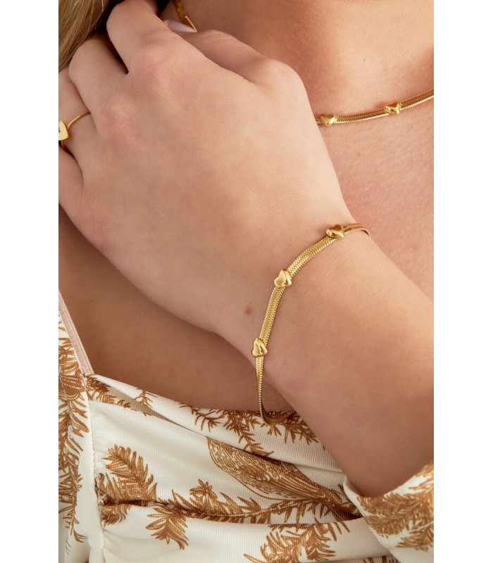 Deze prachtige goudkleurige armband is een ware blikvanger voor elke gelegenheid. Met zijn unieke ontwerp van drie delicate harten straalt deze armband liefde en elegantie uit. Het perfecte accessoire om je pols te accentueren en je outfit compleet te maken.
