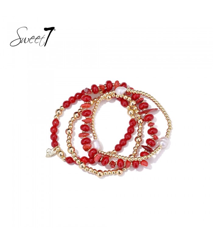 Wat zegt meer dan woorden? Deze armband van Sweet7 vertelt een verhaal van kracht en liefde. De dieprode kralen staan symbool voor passie, terwijl de glanzende goudkleurige accenten warmte en luxe uitstralen. Een subtiel hartbedeltje voegt net dat vleugje romantiek toe. Is dit het accessoire dat jouw look een betekenisvolle touch geeft? De lengte van de armband is 18.5 cm De armband is op elastiene geregen