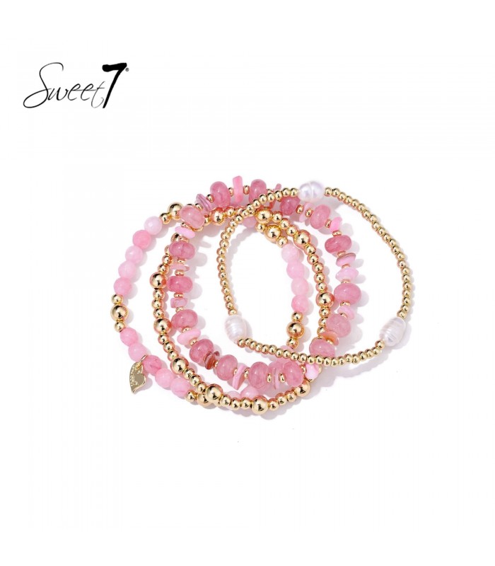 Op zoek naar een armband die elke outfit subtiel laat stralen? Deze armbanden set combineert glanzende goudkleurige kralen met roze edelsteen look en parelaccenten. De kleuren doen denken aan een zwoele zomeravond, zacht en verfijnd. De elastische pasvorm maakt het dragen moeiteloos stijlvol.